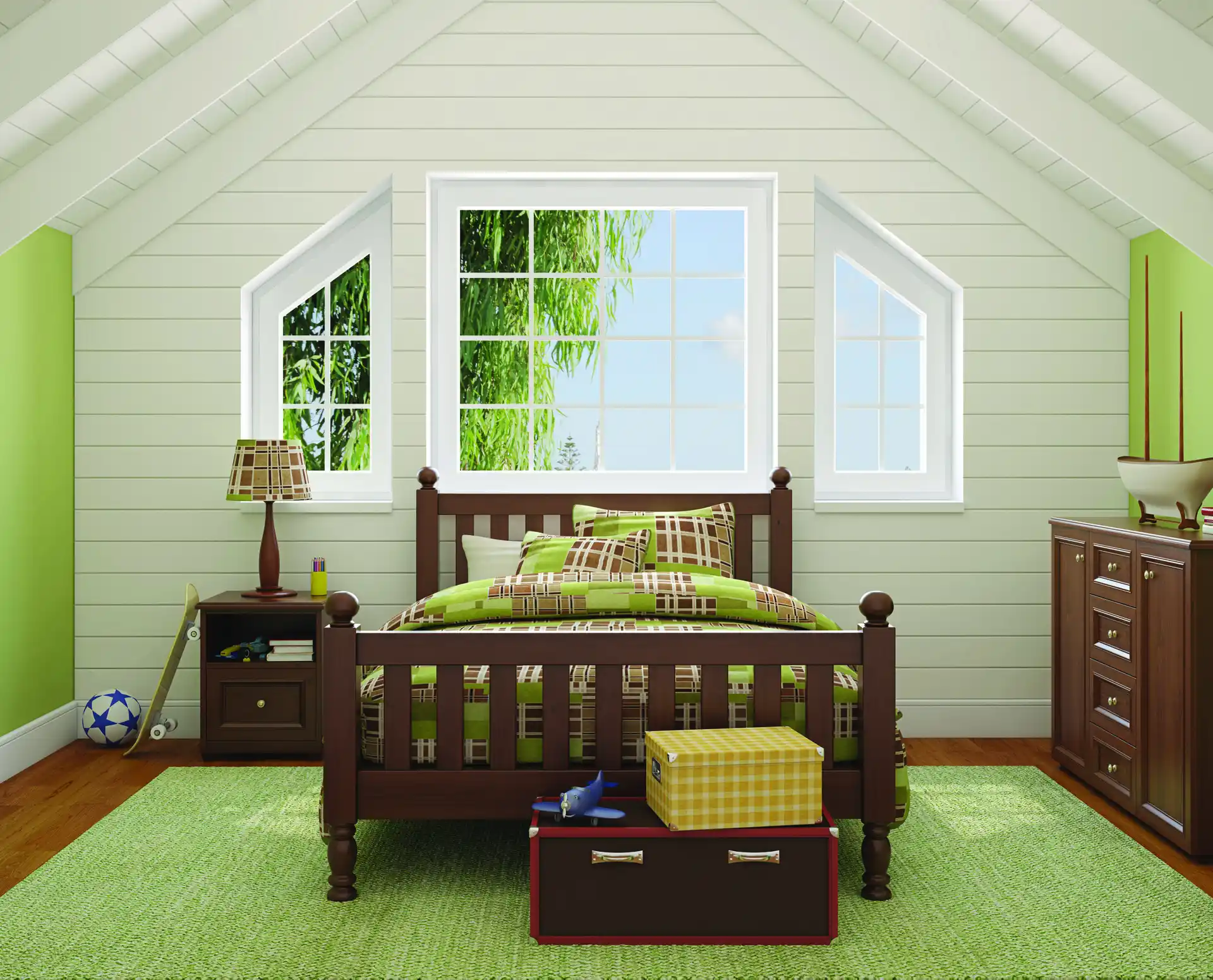 • Fixed-glass, geometric-shaped windows enhance architectural appeal